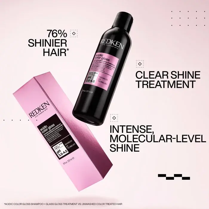 Redken's Acidic Color Gloss Activated Glass Gloss Treatment is an at-home professional strength glossing treatment that deeply conditions and adds intense, molecular-level shine for color-treated hair. A pH-balanced formula with Citric Acid and Apricot Oil, this pre-activated ultra-acidic formula helps seal the cuticle and locks in glass-like shine for up to 3 days and +76% shinier hair**. This rinse out glossing treatment leaves hair looking and feeling revitalized. Use as a complete routine with Acidic Color Gloss Shampoo, Conditioner and Heat Protection Leave-In Treatment.